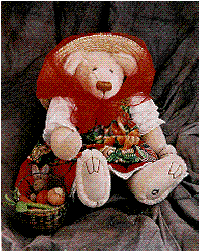 Verna stands 17 inches tall, is fully jointed and made of hand-dyed beige German mohair with German glass eyes, ultrasuede paws and a hand stitched nose. Verna is wearing her gardening outfit and laced petticoat. She is wearing her sun hat to keep the sun out of her face, while she harvests her goodies. In her basket she carries her goodies along with an unwelcome guest in her garden, a bunny rabbit. Outfit Limited Edition of 5 $243.00 US plus S&H |