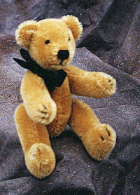 Snappy stands 6 inches tall and is a delightful fellow, made of gold colored German mohair, glass eyes and jointed using snaps. Snappy is also available in brown and grey.
