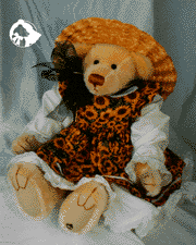 Verna stands 17 inches tall, is fully jointed and made of hand-dyed beige German mohair with German glass eyes, ultrasuede paws and a hand stitched nose. Verna is wearing her a delightful sunflower outfit and laced petticoat. She is wearing a sun hat to keep the sun out of her face. Note her hankie in her pocket...just in case the sunflowers make her sneeze. Outfit Limited Edition of 5 $243.00 US plus S&H. |