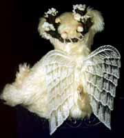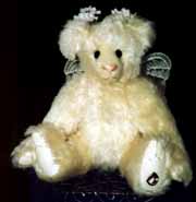Angie Two Angies are available. This one is number 5 of 6. Below is number 6 of 6. Angie is a very special bear, designed in memory of my mother-in-law, Peggy. Angie was the name of her angel. She stands 9 inches tall, (when she is not flying) is fully jointed and made of off-white German mohair with German glass eyes, ultrasuede paws, she wears a handmade floral halo and of course she has beautiful wings. Polyfil. Closed Edition Reference #5 Angie $129.00 US plus S&H. Reference #6 Angie(shown below) $129.00 US plus S&H. ![]() |
