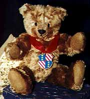 Philip Johan Braun Philip Johan Braun, is a special edition made for the Braun Reunion. He is wears a pendant with the Braun Family Crest on it. He was produced as a fund raiser. He stands 10 inches tall, is fully jointed and made of antiqued light brown distressed mohair with shoe button eyes, wool felt paws and a black hand-stitched nose. Closed Edition of 8. Reference Braun $139.00 US plus S&H. |