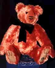 Mr. Copperfield Closed Edition. He Number 4 of 4. Mr. Copperfield stands 12 inches tall, is fully jointed and made of beautiful hand-dyed brownish rose German mohair with German glass eyes, taupe ultrasuede paws and a brown hand-stitched nose. He picked out the ribbon. Polyfil. Reference #4 Mr. Copperfield $129.00 US plus S&H. |