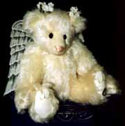 Angie Two Angies are available. This one is number 5 of 6. Below is number 6 of 6. Angie is a very special bear, designed in memory of my mother-in-law, Peggy. Angie was the name of her angel. She stands 9 inches tall, (when she is not flying) is fully jointed and made of off-white German mohair with German glass eyes, ultrasuede paws, she wears a handmade floral halo and of course she has beautiful wings. Polyfil. Closed Edition Reference #5 Angie $129.00 US plus S&H. Reference #6 Angie(shown below) $129.00 US plus S&H. ![]() |